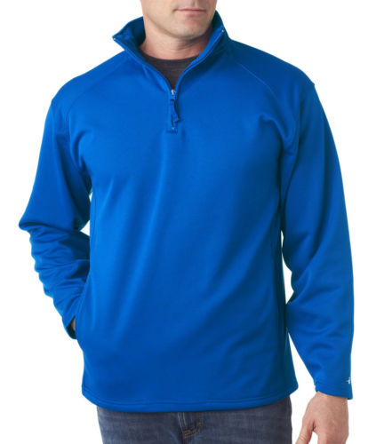 100% Polyester moisture management fabric • ¼ Zip front with self fabric collar • Full hidden tunnel pocket with headset opening • Open bottom • Cuffs feature smooth hem front with rib on back half • Embroidered Badger logo on left sleeve • Sizes: XS-4XL
