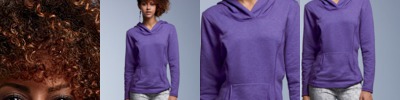 preshrunk 40% ring-spun cotton/60% polyester terry fleece • 7-oz. • 30 singles • semi-fitted silhouette with princess side seams • 1/4" contrast grey neck tape • unlined crossover hood • pouch pocket • 3" 1x1 rib-knit cuffs and waistband with spandex • triple-needle topstitched hood neck, shoulders and waistband • triple-needle sleeve and bottom hems • woven label • Sizes: S-2XL