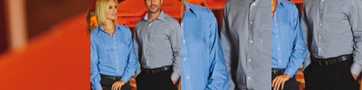 60% cotton/40% polyester • 3.9 oz. • wrinkle-free • spread collar • contrast stripe inside collar • front placket and inside cuffs • left chest pocket • adjustable cuffs • Sizes: S-3XL