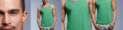 preshrunk 100% ring-spun cotton (blended ring-spun cotton/polyester in heather colors) • 4.5-oz. • 30 singles • tubular construction • bound-on self-fabric trim on neck and armholes • double-needle bottom hem • tear-away label • heather grey cotton/poly blend is 90/10, all other heather colors are 60/40 • Sizes: S-2XL