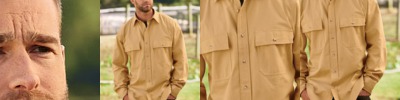 100% combed cotton brushed flannel • 5.5 oz. • double-needle stitching • 2 flap pockets with button closures on chest • pencil division on left chest pocket • back box pleat • Sizes: S-3XL