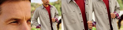 100% combed cotton canvas shell • 7.5 oz. • plaid brushed cotton flannel lining • metal snaps • 2 patch pockets with metal rivets on chest • 2 side seam pockets • Sizes: S-3XL
