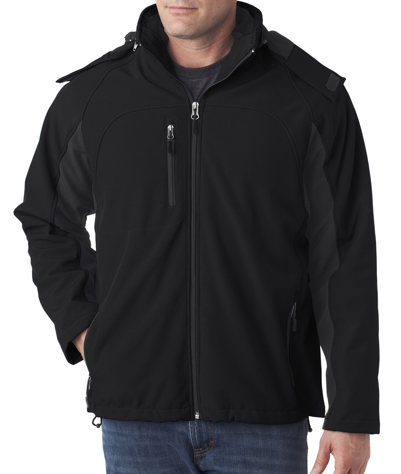 100% polyester bonded soft shell • 9-oz. (shell) • 7-oz. (liner) • water- and wind-resistant • detachable hood with self-adhesive fastener • bungee cord with toggles at bottom hem • contrast inset sleeve and underarm panels • laminated zippered pocket on right chest • zippered front pockets; liner: 100% polyester micro-fleece removable liner • bungee cord with toggles at bottom hem • front pockets; • 3-in-1 jacket system allows shell and liner to be worn separately or zipped together • Sizes: S-4XL