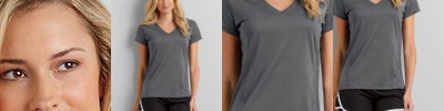 100% filament polyester jersey knit • 4.7 oz. • AquaFX™ wicking properties • Freshcare™ antimicrobial properties • missy contoured silhouette with forward side seams • 1/2” mitered v-neck collar • charcoal neck tape • rolled forward shoulders • double-needle sleeve and bottom hems • heat transfer label • Sizes: XS-2XL