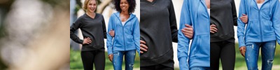 55% cotton/25% metallic yarn/20% polyester French terry • 8 oz. • glitter knit and cover-stitched throughout • 2x1 rib-knit cuffs • waistband and pocket openings • Sizes: S-2XL