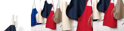 65% polyester/35% cotton twill • 7.5-oz. • adjusts quickly by pulling down on the straps • extra-long ties • 7"w x 8"h approx. center-chest imprint area • 6 3/4" diameter max. center-chest embroidery area • Size: 20"w x 30"L