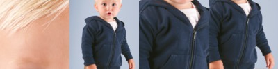 60% cotton/40 % polyester fleece • 7.5-oz. • Jersey-lined double-needle hem hood • Pouch pockets • Coverstitched ribbed cuffs and waistband • Coverstitched shoulders and armholes • Topstitch zipper, hood and neck • White is sewn with 100% cotton thread • Sizes: 6M-18M