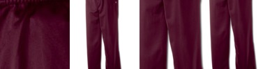 100% Polyester • double Knit • 6.3-oz. • moisture wicking • odor resistant • stain release • Elastic waistband with draw cord, a brass zipper front and 2 snaps • double layer knee construction with elastic cuff • Sizes: Adult: XS-2XL